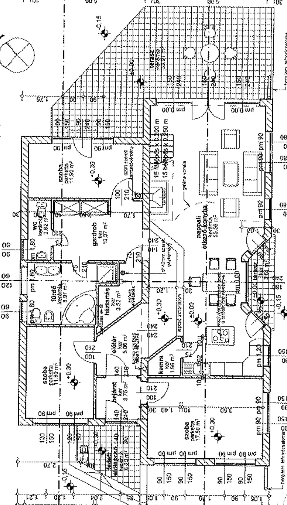 -- Alsó szint (132 m²): nappali, étkező, konyha, kamra, 3 hálószoba, fürdő, külön WC, terasz.