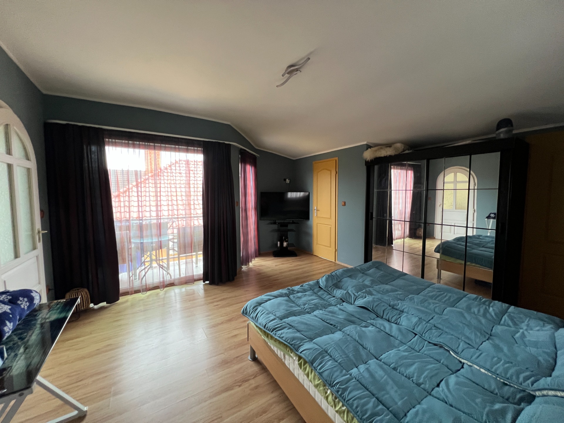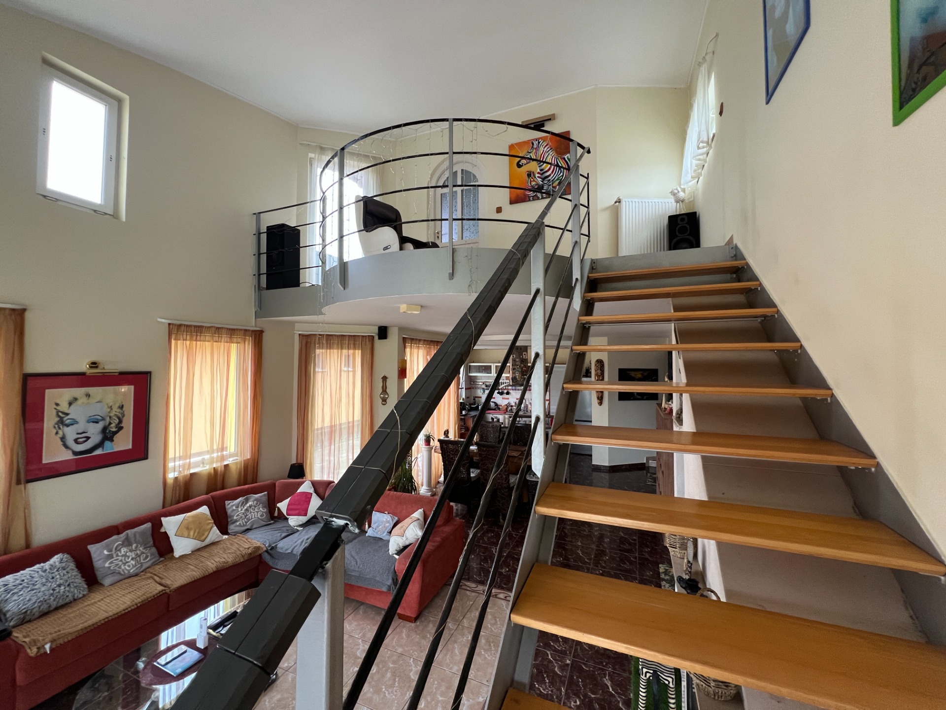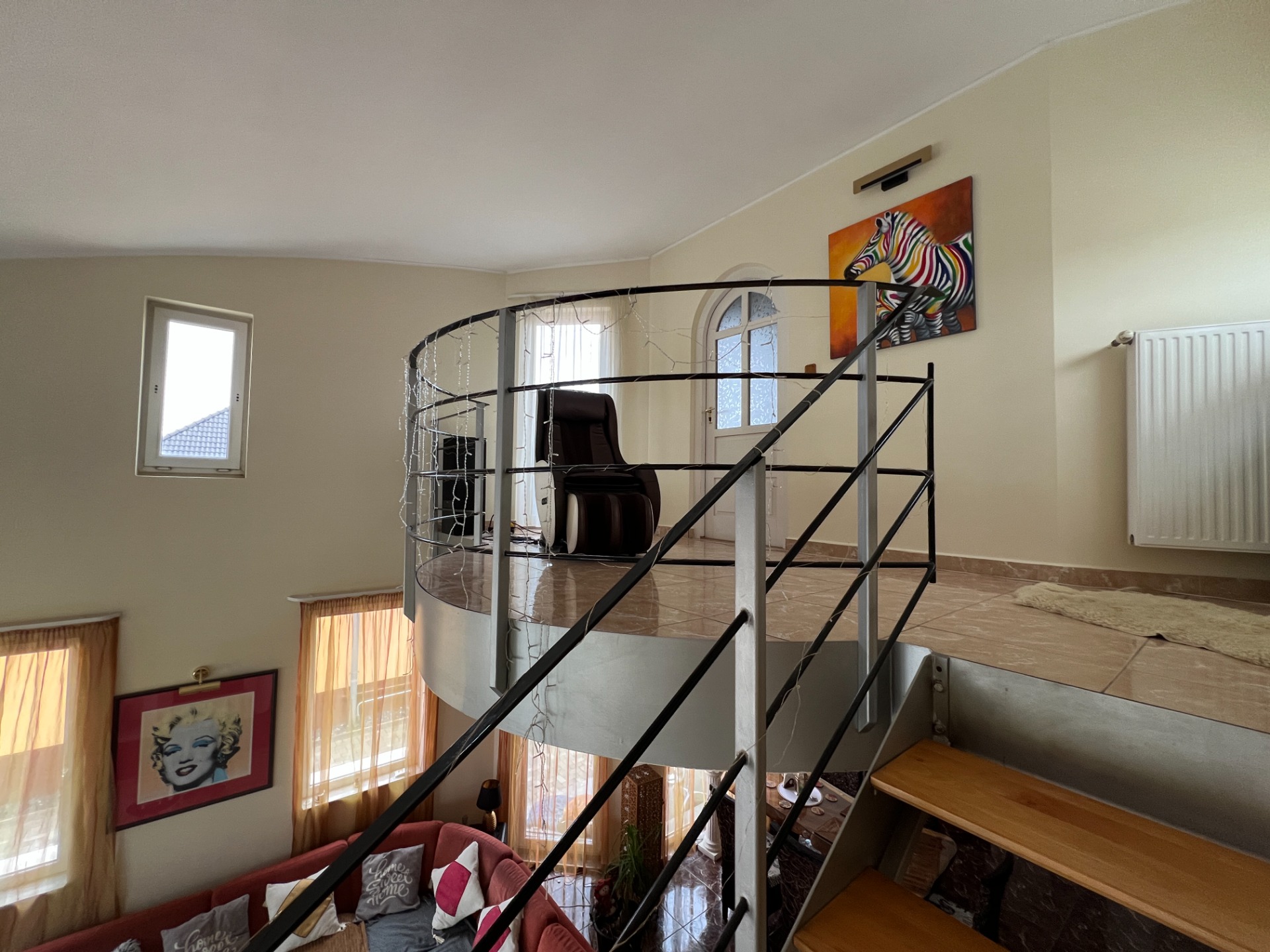 -- Felső szint (48,5 m²): galériás olvasósarok, külön szoba saját fürdővel és WC-vel, erkély.